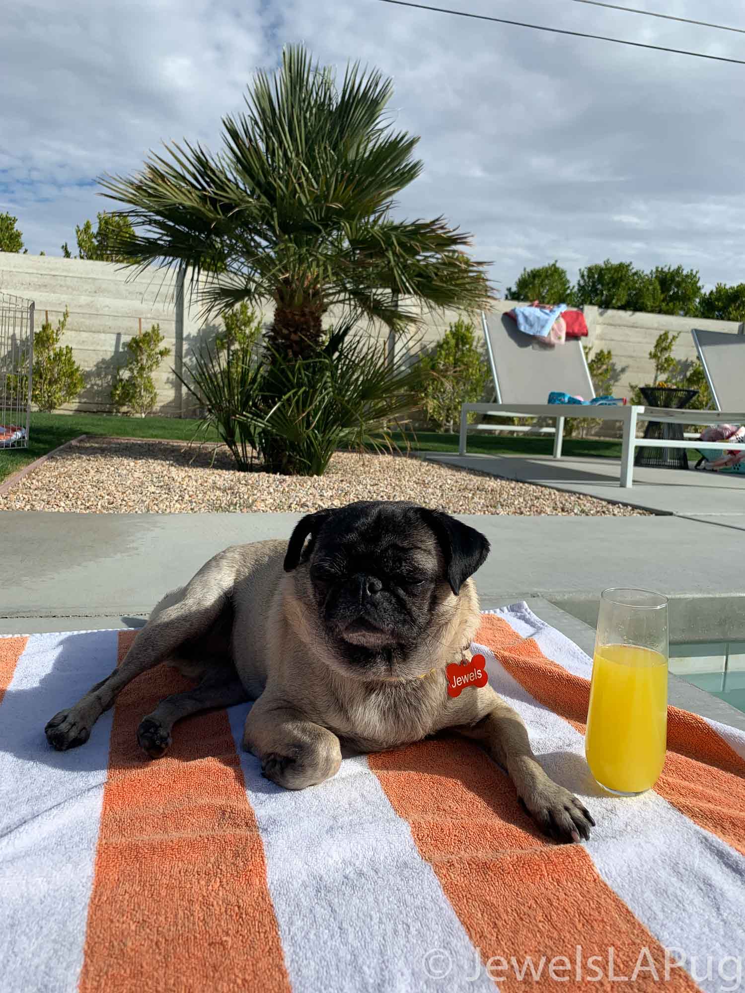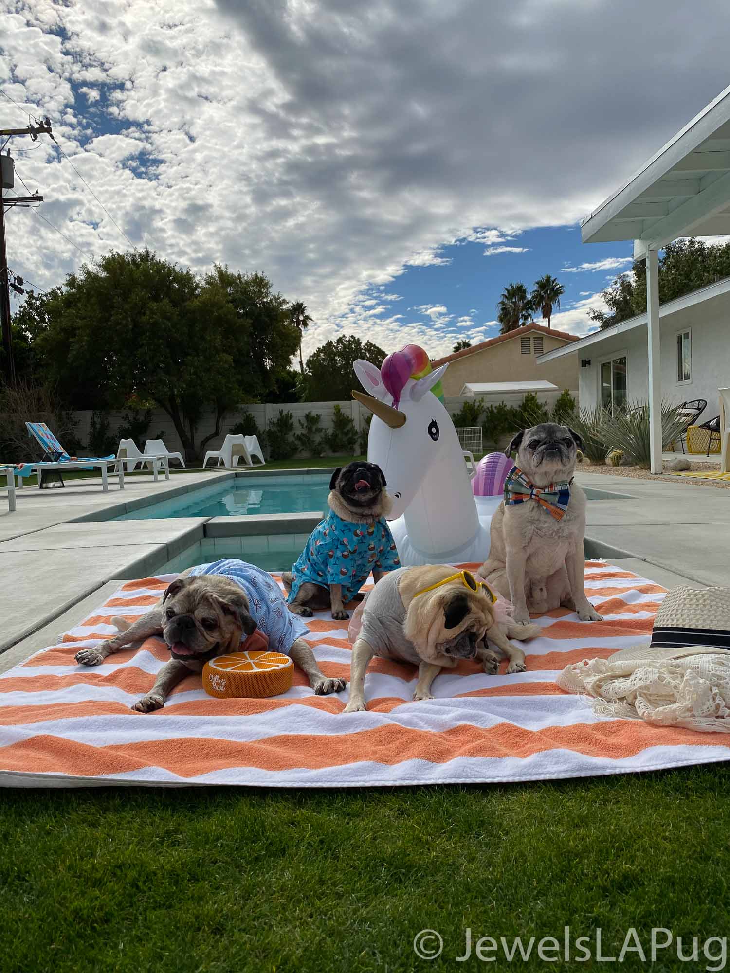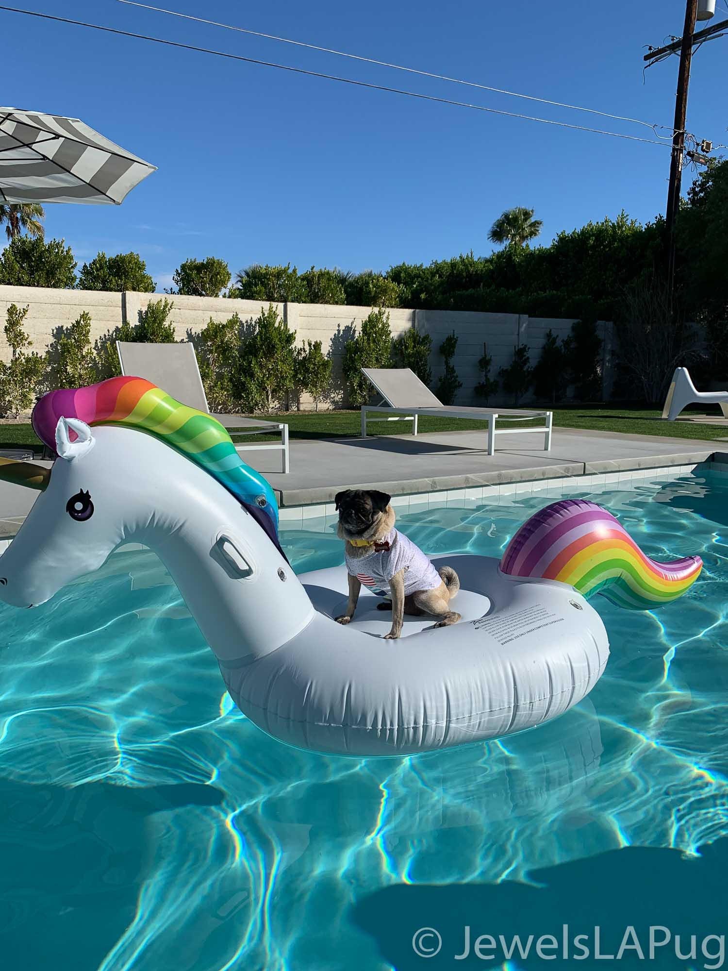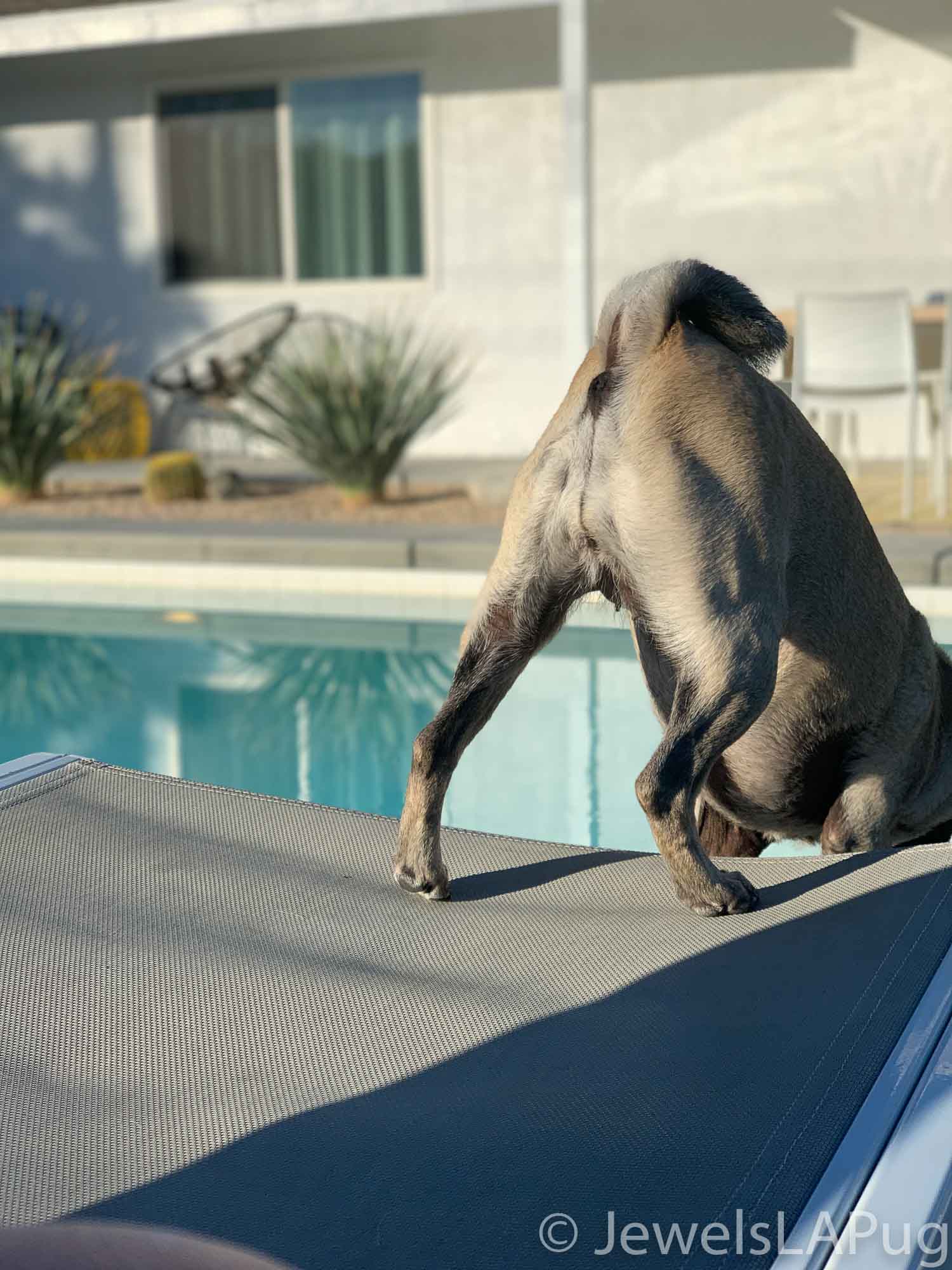 So, my friends, Monty, Ivy, George, Taz and I had a fun drive up the 10 from LA to Palm Springs. We were so excited to be spending the whole weekend together and the car was loaded with enough snacks for an army of pugs, not just our grumble. You would not believe how full the trunk was with all our weekend party kit. It already had the makings of an epic few days!!