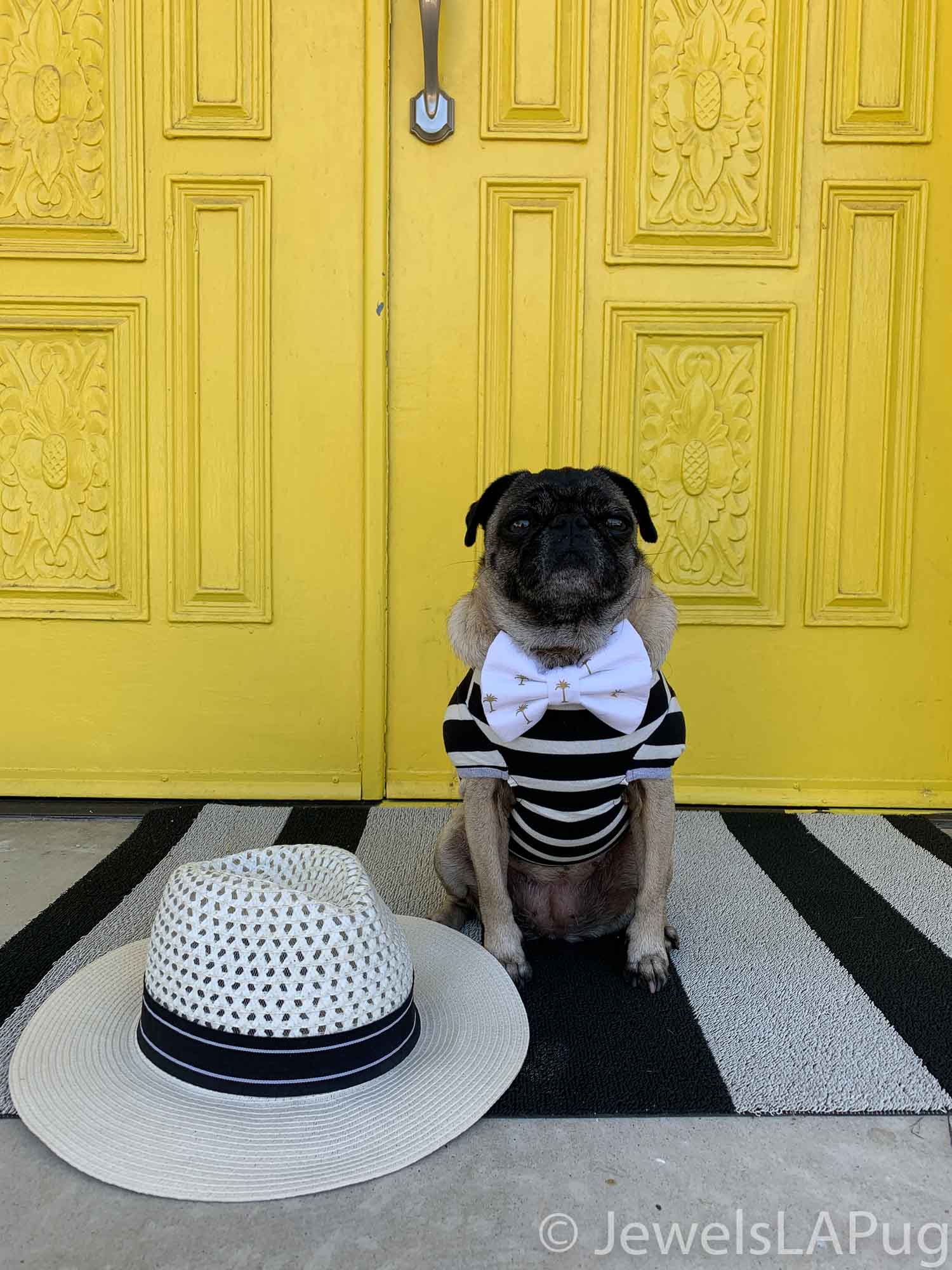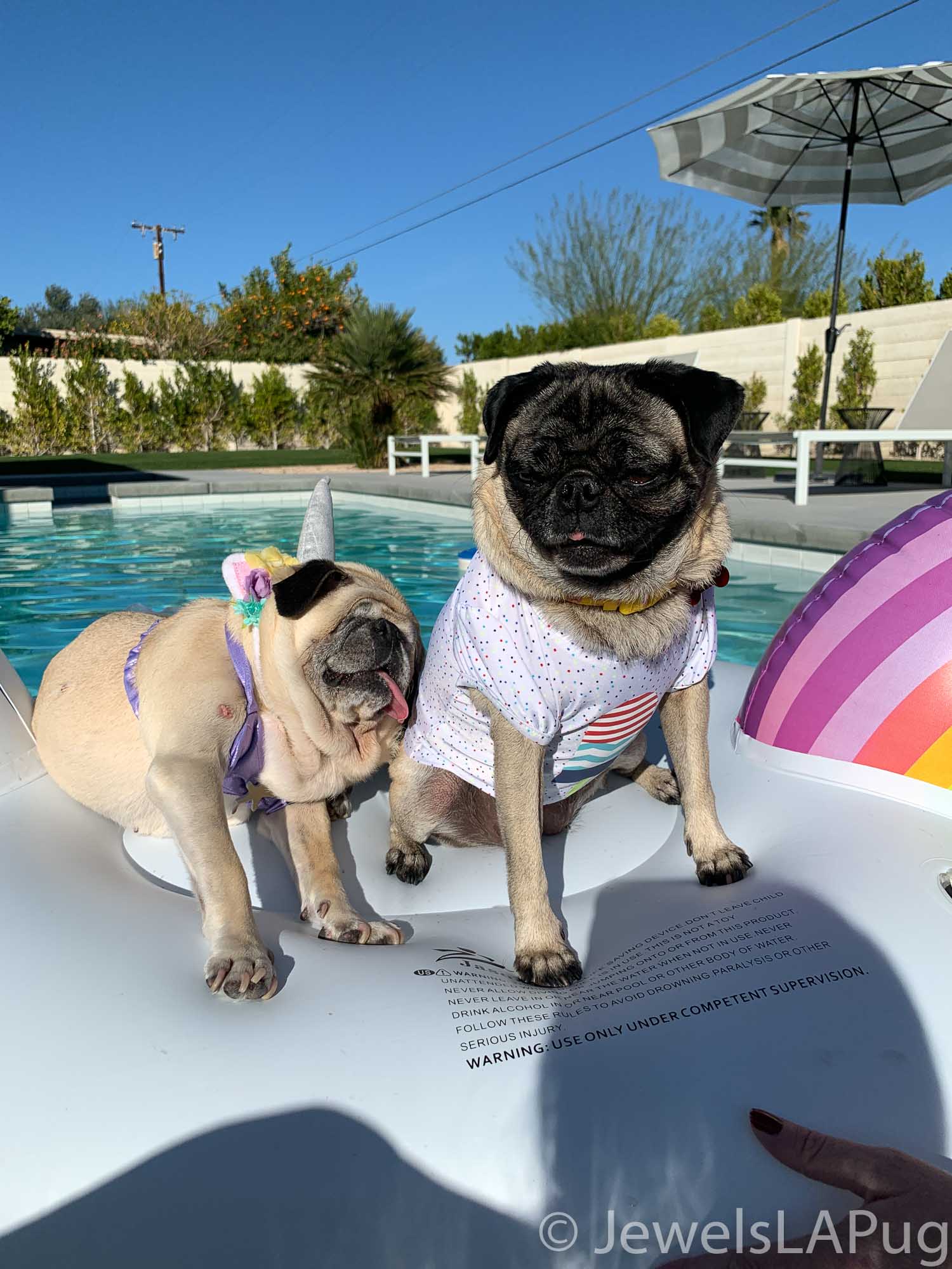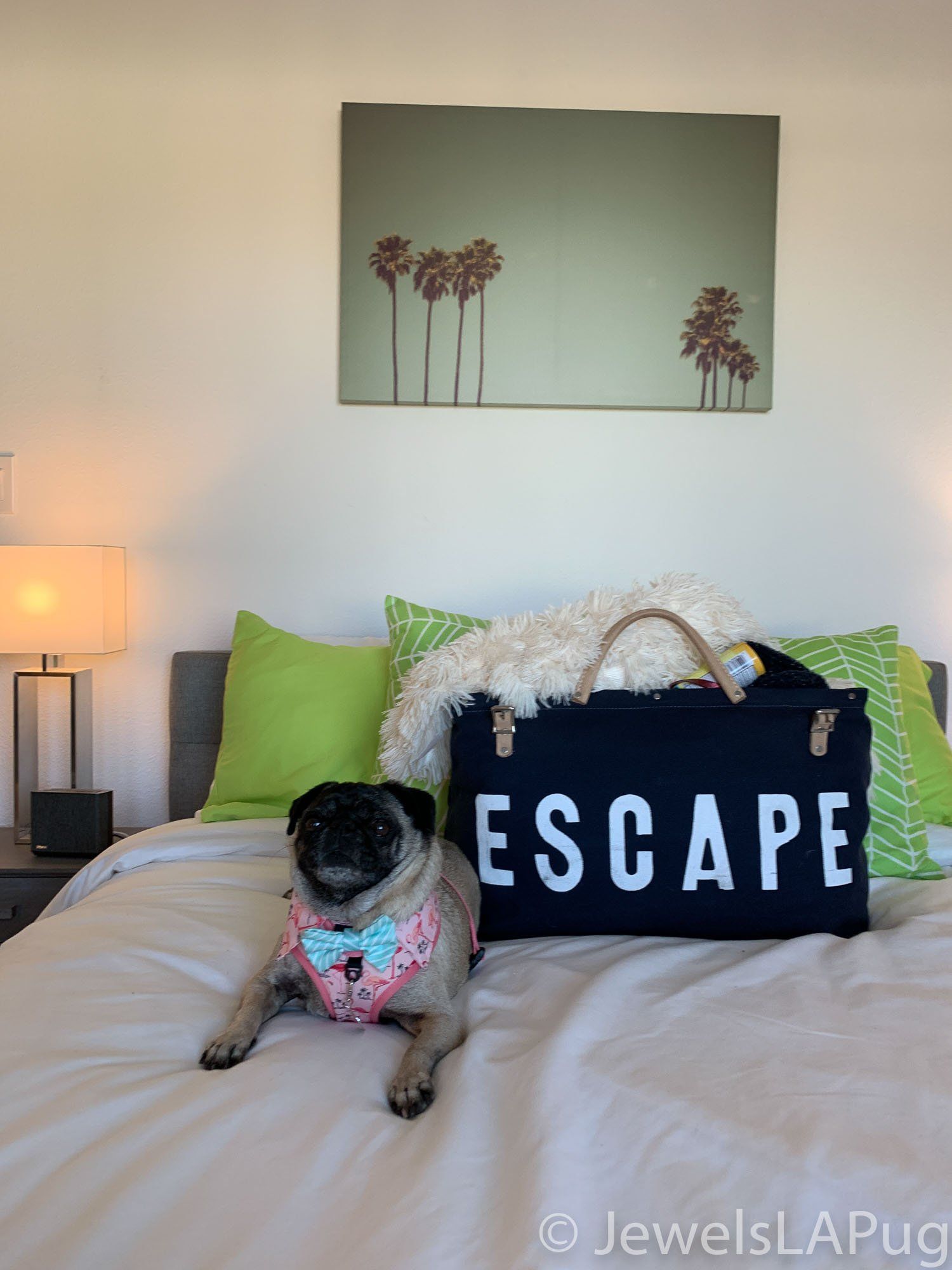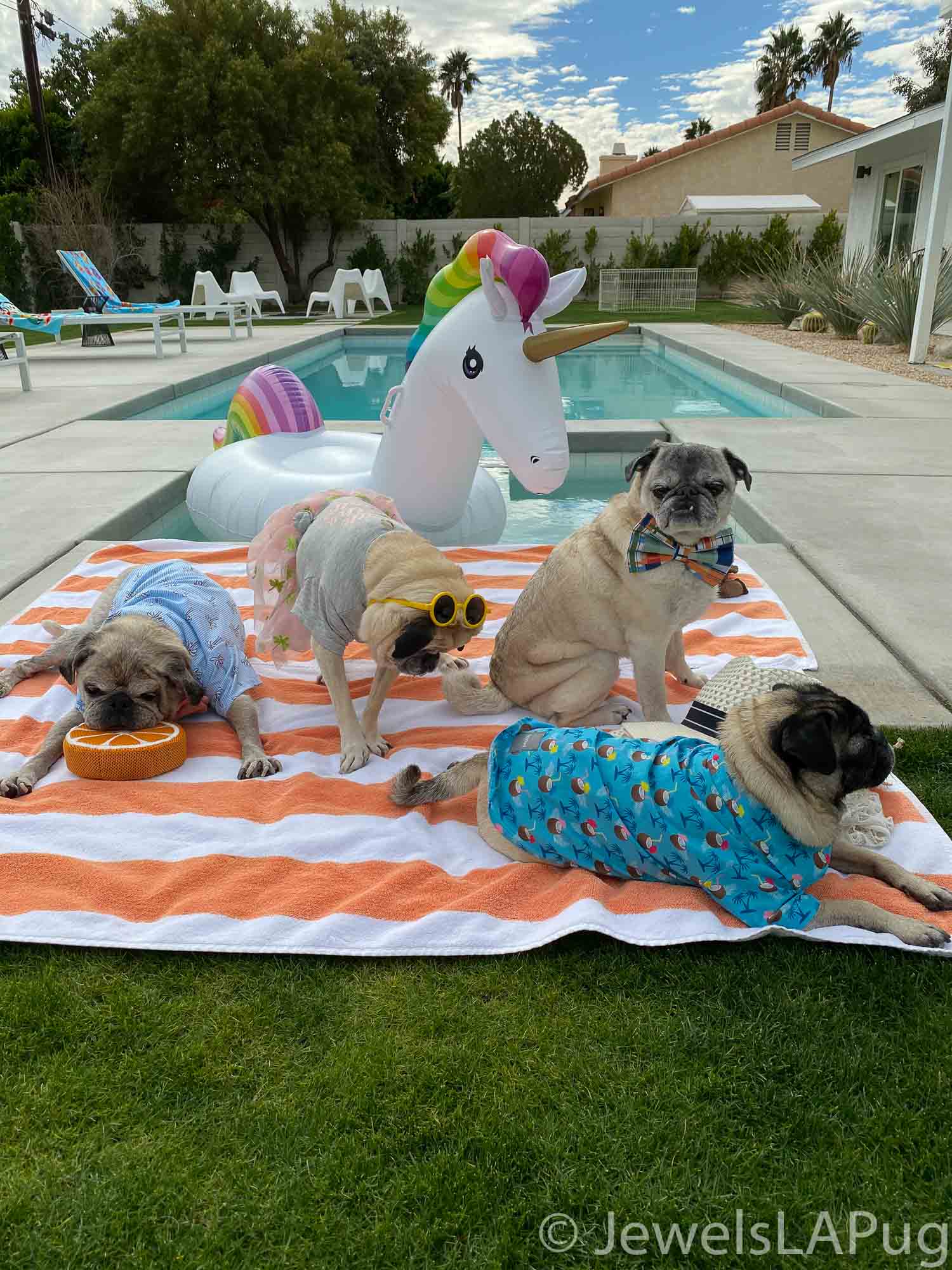 So, my friends, Monty, Ivy, George, Taz and I had a fun drive up the 10 from LA to Palm Springs. We were so excited to be spending the whole weekend together and the car was loaded with enough snacks for an army of pugs, not just our grumble. You would not believe how full the trunk was with all our weekend party kit. It already had the makings of an epic few days!!
